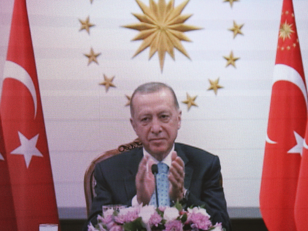 Le chef de l'Etat, encore pâle, s'est présenté en combinaison rouge de pilote sur l'ancien aéroport Atatürk d'Istanbul où se tient le salon aéronautique Teknofest. La Turquie présente ce salon qui permet à l'industrie militaire turque d'exposer ses drones comme "le plus grand du monde".