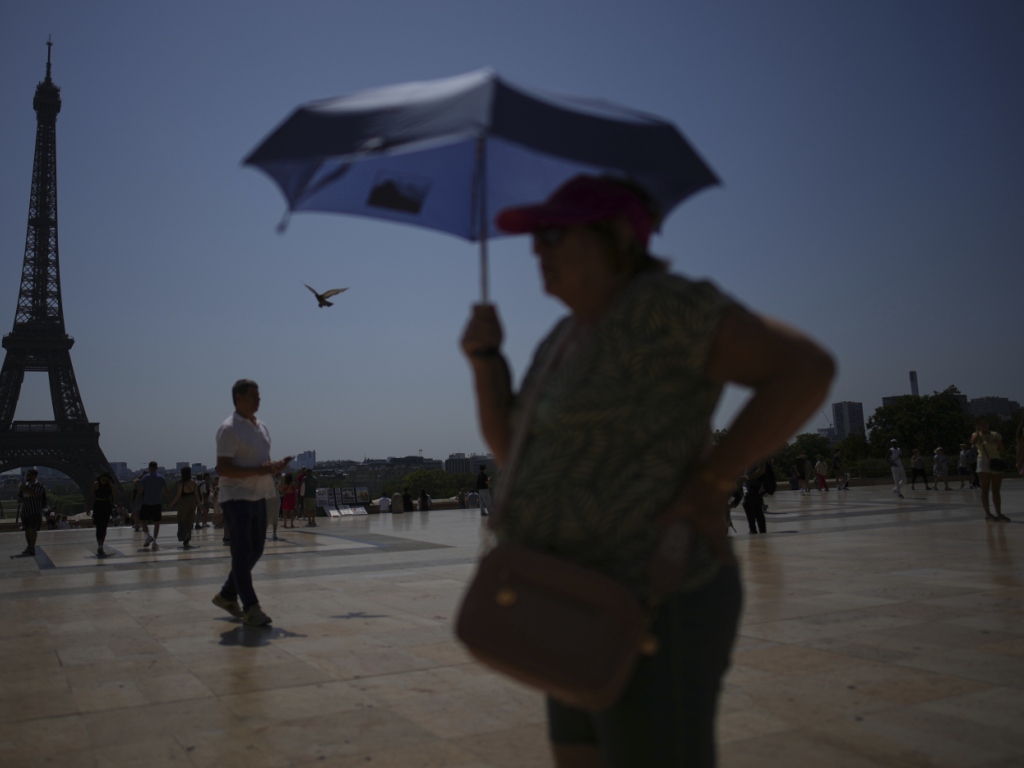 Un touriste s'abrite du soleil avec une ombrelle, sur le Trocadero à Paris, lors d'un épisode caniculaire de juillet. (image d'illustration) (© KEYSTONE/AP/CHRISTOPHE ENA)