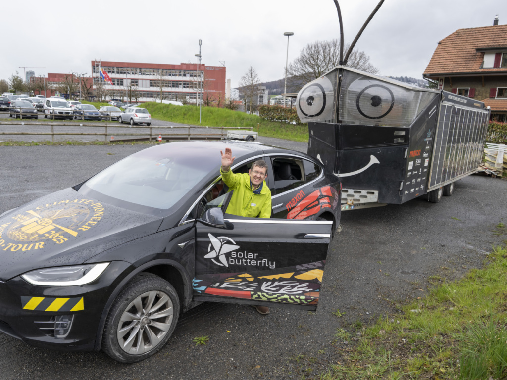 Le chef de projet, l'aventurier suisse des véhicules solaires Louis Palmer, est arrivé jeudi matin sur le campus de la Haute école de Lucerne à Horw. Il avait démarré en mai 2022 le voyage à bord du Solar Butterfly, après un premier tour du monde en 2007-2008 au volant d'un taxi solaire.