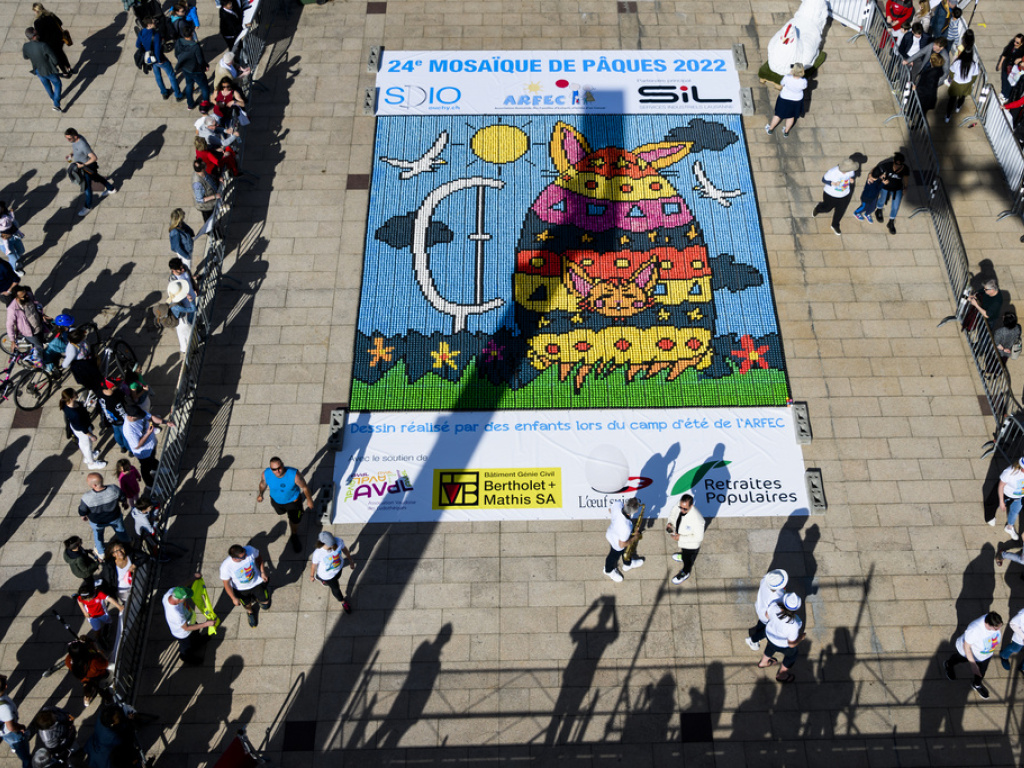 La traditionnelle mosaïque d'oeufs qui pare la place de la Navigation à Ouchy à Lausanne à Pâques a vécu dimanche sa 24e et dernière édition. Durant près d'un quart de siècle, environ un million d'oeufs ont été utilisés pour 24 fresques, permettant de récolter près de 850'000 francs pour des oeuvres caritatives.